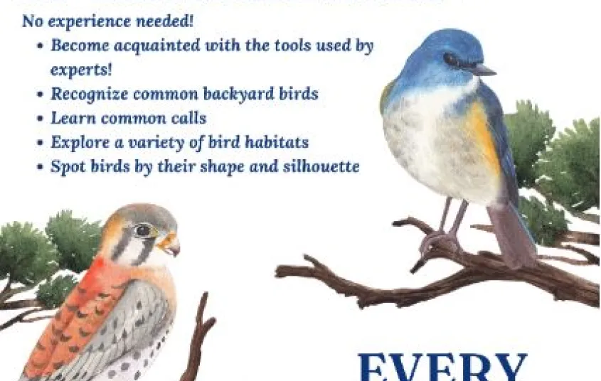The session begins with an indoor introduction to bird groups and birding materials, followed by a guided trail walk where participants will put their new skills to use. By the end of the program, attendees will be able to identify local birds and feel confident continuing their birding journey on their own.