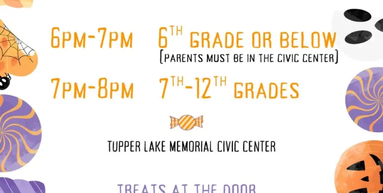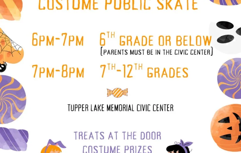 Students are invited to a Halloween Costume Public Skate at the Tupper Lake Memorial Civic Center.