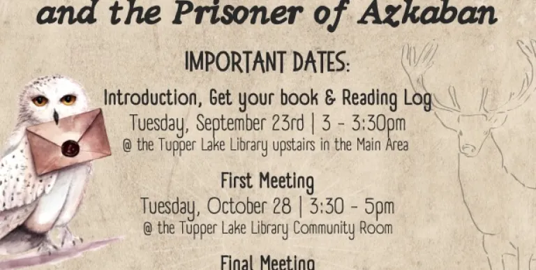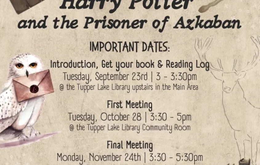 For 3rd–6th graders! Join us as we dive into Harry Potter and the Prisoner of Azkaban at the Tupper Lake Library.