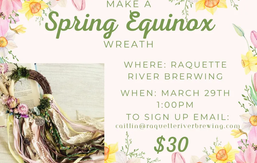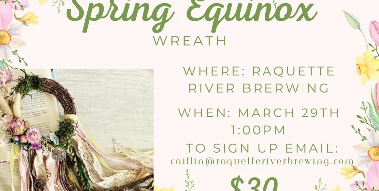 Celebrate the arrival of spring with a Spring Equinox Wreath Workshop at Raquette River Brewing. Join Caty on March 29, 2026 at 1 PM and create a beautiful seasonal wreath to welcome the new season.
