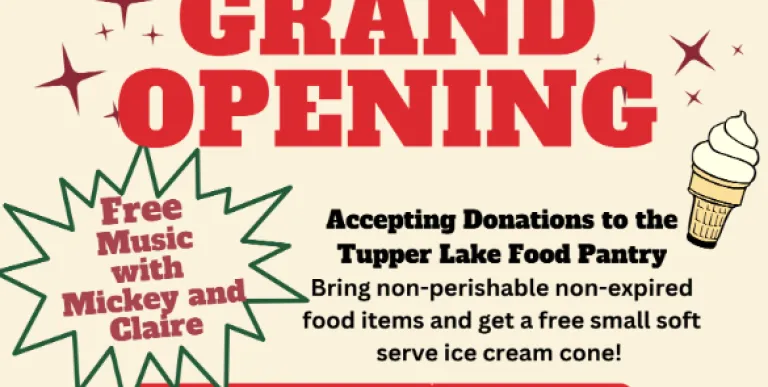 - Special Offer: Bring non-perishable, non-expired food items to donate to the Tupper Lake Food Pantry and receive a free small soft-serve ice cream cone.