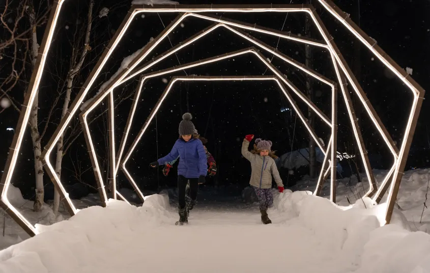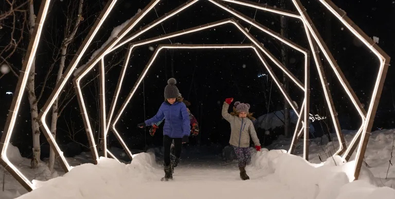 - Indoors: Warm up inside with hot drinks, food, and an opportunity to check out the Living River Trail (otters included!). Interactive light-up pieces, like an oversized LiteBrite, provide fun for kids and a chance for old-school nostalgia for adults.