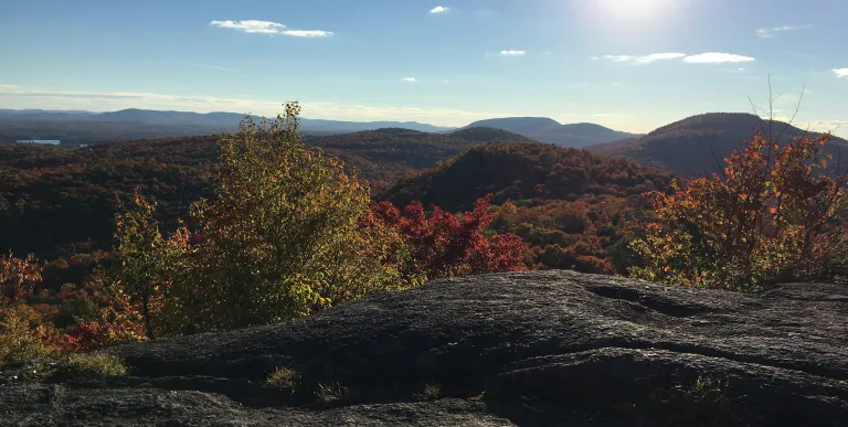 The trail leaves the gate and follows a forest road, where a bit of flooding can occur thanks to beaver activity. Bear right when the road splits — don’t follow the left fork. Soon after the split, the trail leaves the road and begins a moderate climb over rocky terrain, then a couple of short, steep pitches end at Floodwood's highest summit. Look for a sign on a tree to find the 0.25-mile trail to the southern summit, which requires a short, steep descent over slab rock followed by a short rock scramble that ends at the summit.
