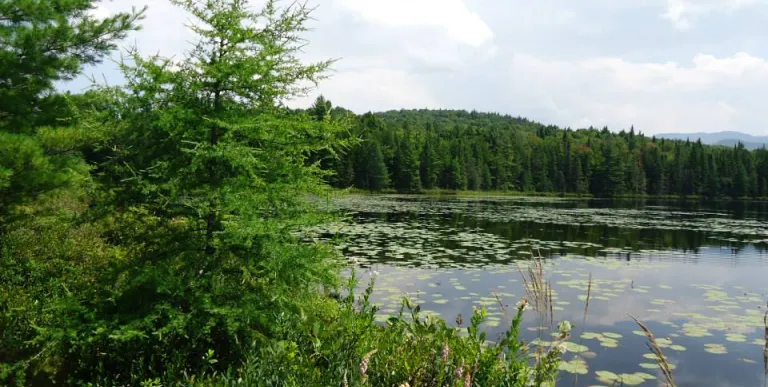 The trail starts along an old woods road on a slight but steady climb before quickly cresting a small hill. From here it becomes a foot trail with an easy descent. The trail swings a bit and meanders through the darker forest before coming to the grassy shore of Pickerel Pond. The Seward Range can be seen over the pond in the distance.