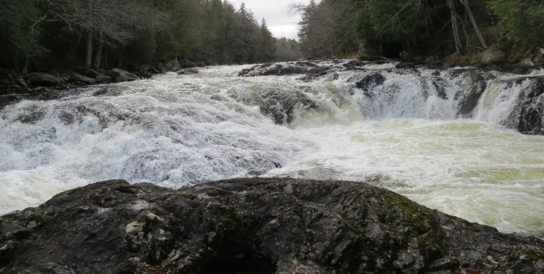 Hikers can continue past the Lower Falls on a trail with rough, and at times, steep terrain along the Raquette River to the junction with the canoe carry trail. To add this hiking loop would require about 2.5 more miles of hiking. The total round trip distance would be just over 11 miles.