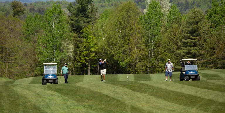 A man at the end of his golf swingGolfer in a cart smiles at the camera.A golfer puts from the green of the Tupper Lake Golf ClubTwo golfers in a cart approach the restaurant at the Tupper Lake Golf Club
