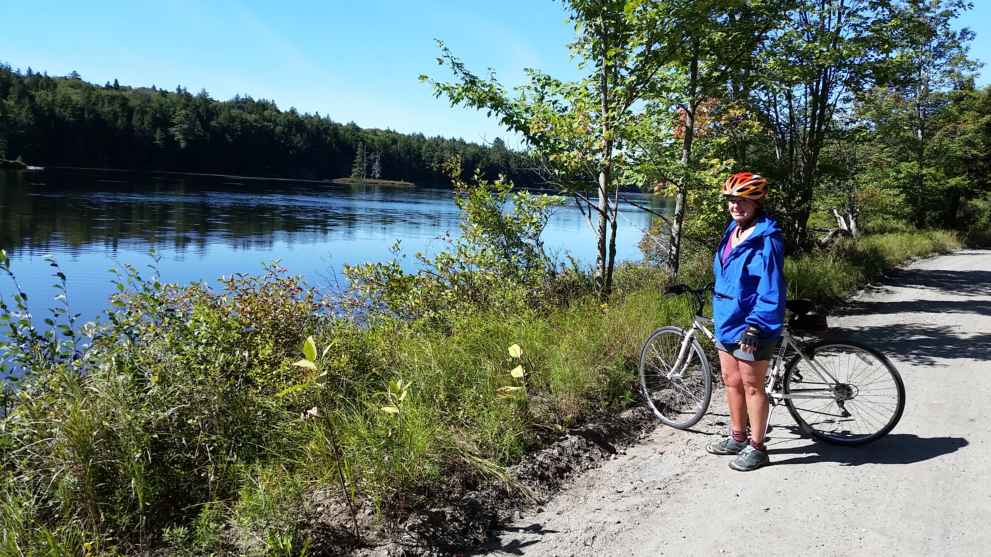 On the way out we stopped at East Pine Pond and walked our bikes to the parking area. Trisa suggested that we take the path to the left of the parking lot to the campsite for lunch. She had previously been to this site, I had not. The campsite was wonderful. We watched and listened to the loons on the pond while enjoying our lunch.