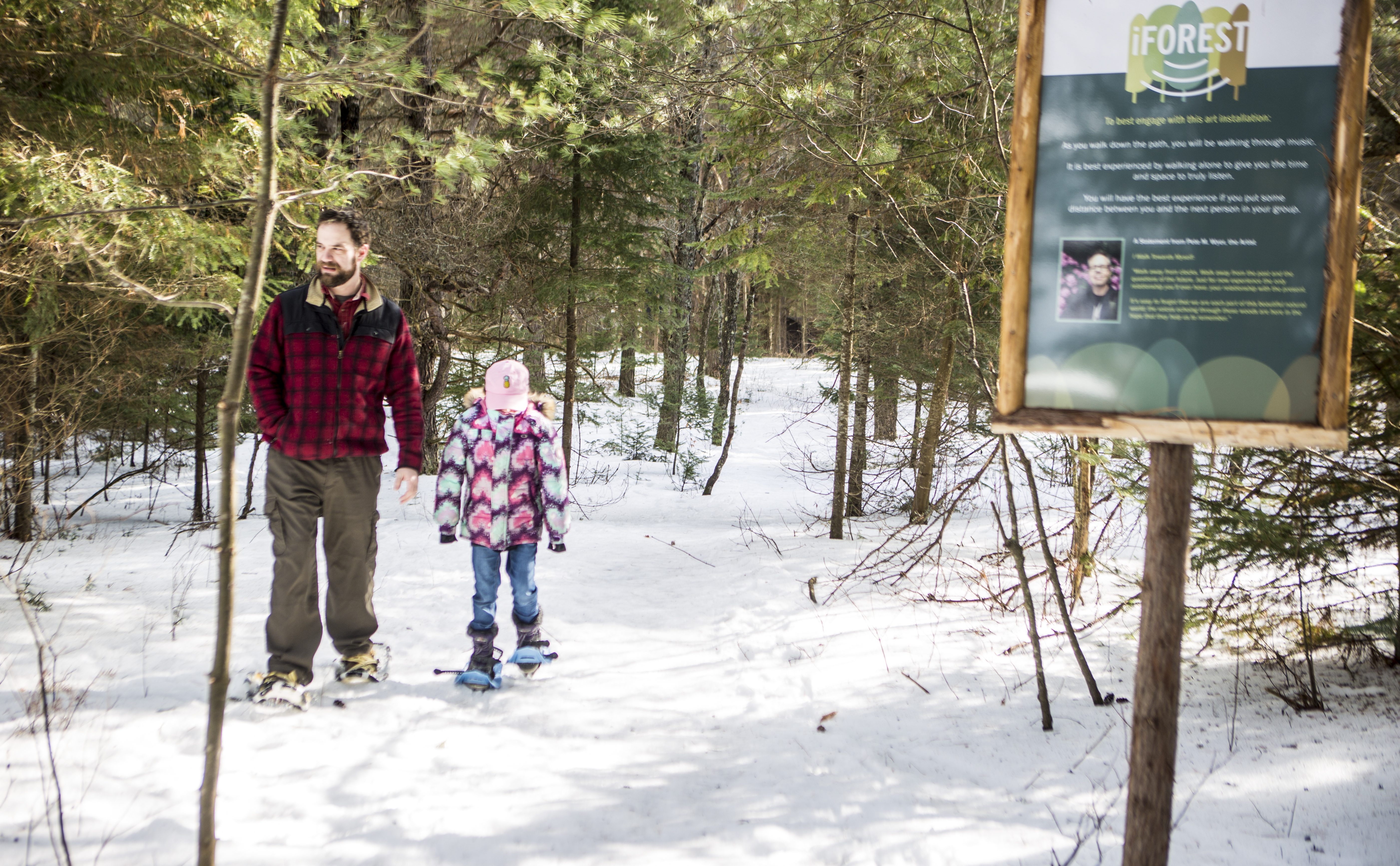 While you are exploring the trails on snowshoes, keep an eye out for Hopscotch, the stickwork creation. Patrick Dougherty and a group of volunteers put together this large immersive art piece from saplings. Children and guests can walk through Hopscotch and discover nature through a new angle!