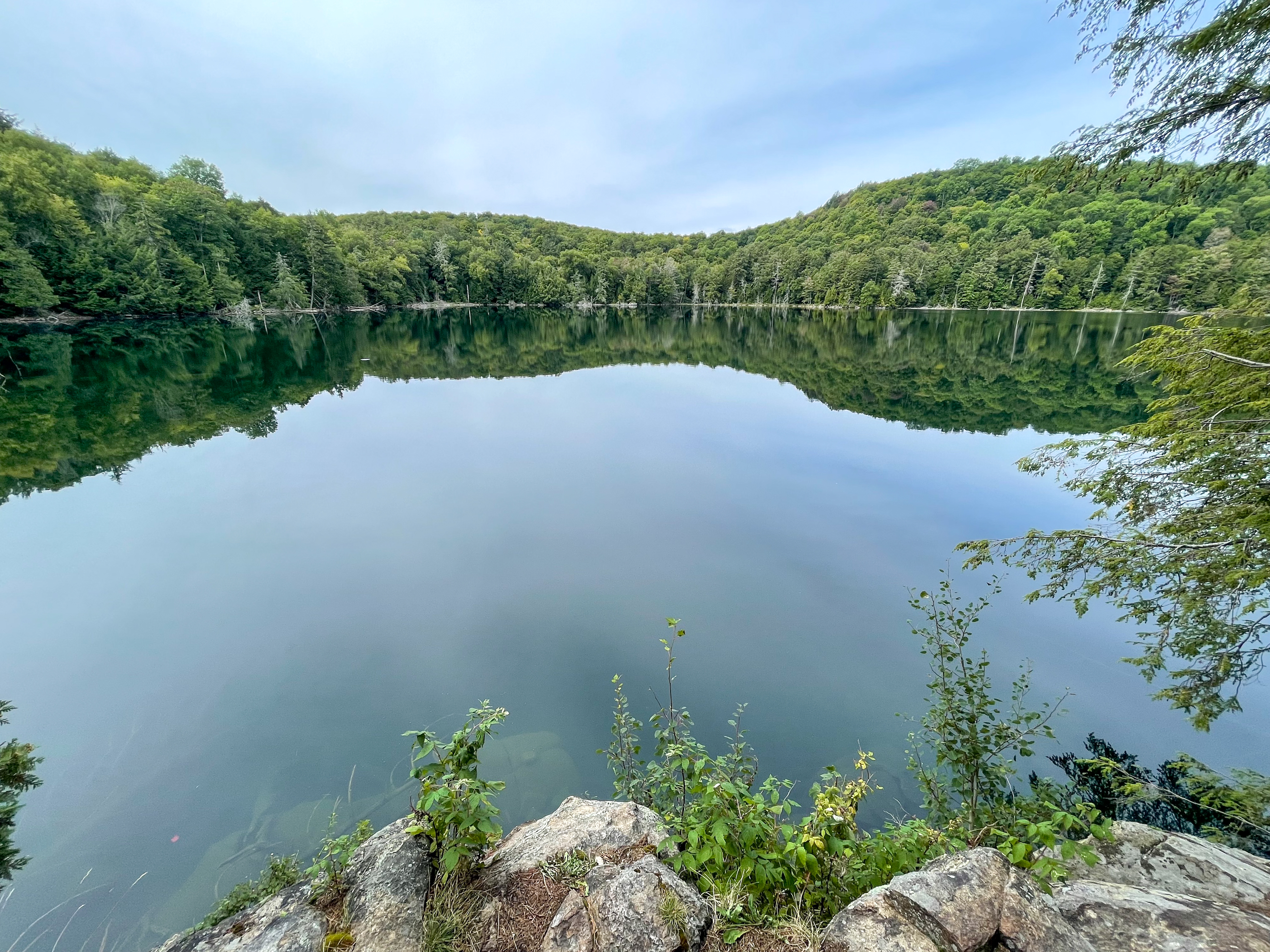 Unsuspectingly, Deer Pond’s trailhead is right off the main road: you can find the main access point on Route 3 about 5-miles outside of downtown Tupper Lake. Truth be told, until recently, I hadn’t visited this spot in fall or summer; I’ve only cross-country skied the loop. But I’m always up for something new. I decided to follow in my ski tracks and do the loop clockwise (meaning I’d have to walk up the big hill). Admittedly, I struggled to get up the hill on my skis so I considered this redemption. More than half of this loop is over level ground, but there are some steeper climbs along the way. I took it easy, enjoying the sights and sounds of the late summer forest (especially the calls of Golden-crowned Kinglets and Blue Jays!). The trees along the trail are beautiful. I remember thinking the same thing when I was here last winter and everything was covered in snow.
